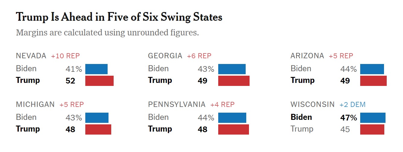 Згідно з опитуванням, за рік до виборів президента 2024 року демократ Джо Байден відстає в п'яти з шести найважливіших штатів проти республіканця Дональда Трампа. За попередніми даними, його на 3-10% менше підтримали респонденти в Аризоні, Джорджії, Мічигані, Неваді та Пенсильванії. У Вісконсині Байден випереджає Трампа лише на 2%.